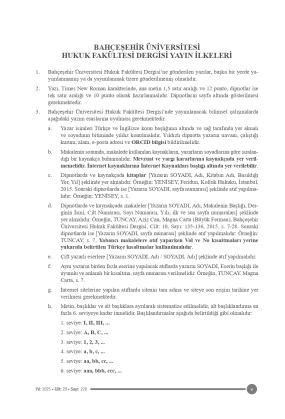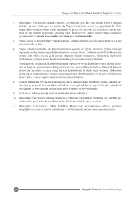 10. Bahçeşehir Üniversitesi Hukuk Fakültesi Dergisi’nde yayımlanan yazılarda ileri sürülen görüşler ve bu yazılardan kaynaklanacak her türlü sorumluluk yazarlara aittir.
